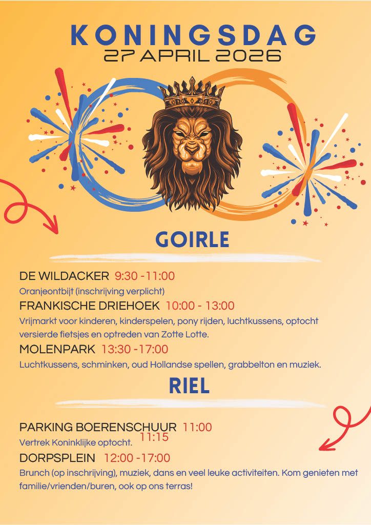 • Riel: Koninklijke optocht, brunch op het Dorpsplein, middagfeest met optredens, spellen, kramen en demonstraties.